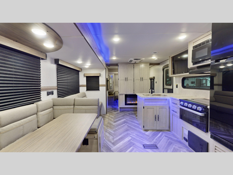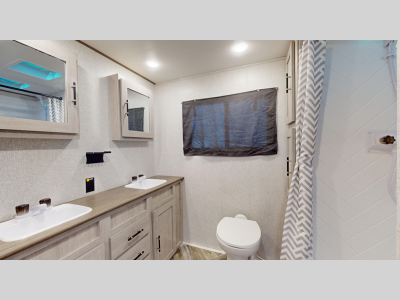 Sleeps 5 Slides 2 Length 33 ft 8 in Ext Height 11 ft 4 in Int Height 6 ft 9 in Hitch Weight 802 lbs Dry Weight 7550 lbs Cargo Capacity 2050 lbs Fresh Water Capacity 45 gals Grey Water Capacity 42 gals Black Water Capacity 42 gals Available Beds RV Queen Refrigerator Type 12 Volt Refrigerator Size 10 cu ft Cooktop Burners 3 Shower Size 34" LP Tank Capacity 20 lbs TV Info LR 39" TV Axle Count 2 Number of LP Tanks 2 Shower Type Radius Similar Floorplans
